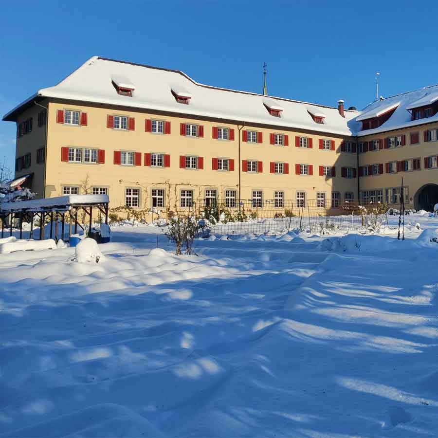 Der Klostergarten hat sich über Nacht in ein stilles Wintermärchen verwandelt. Der Schnee, leise und sanft gefallen, legte sich wie ein weisses Gewand über die Anlage und brachte die franziskanische Schlichtheit und Harmonie der Schöpfung zum Ausdruck.
