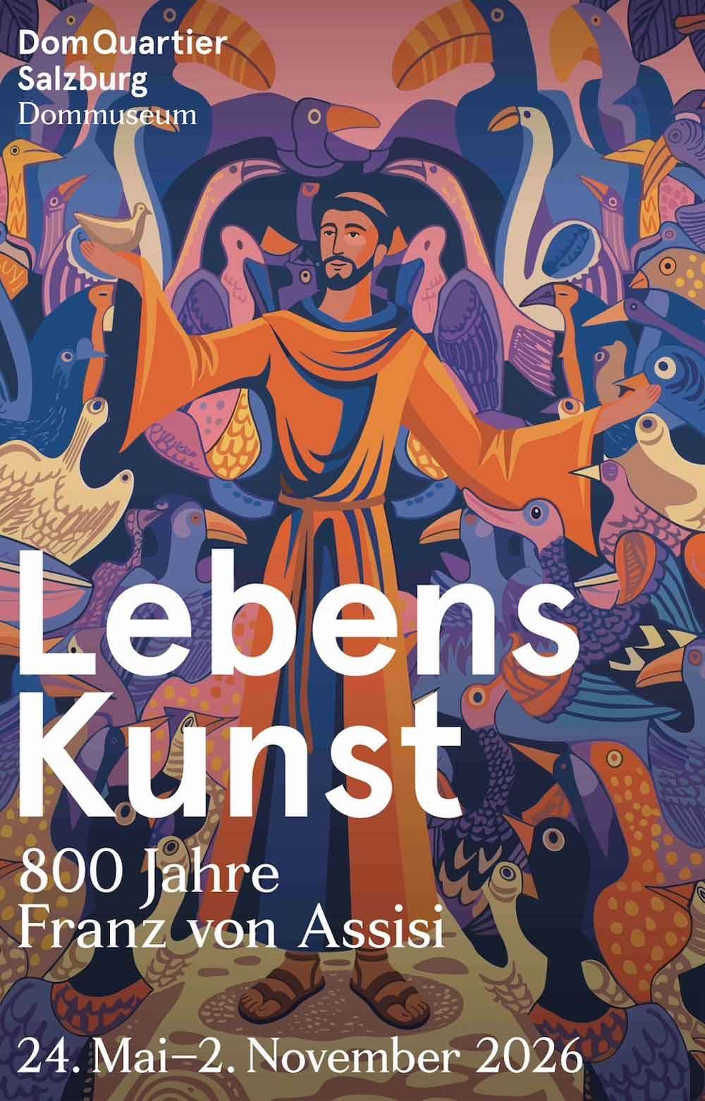Von Mai bis November 2026 lädt das Dommuseum Salzburg zu einer grossen Ausstellung, die Franz von Assisi gewidmet ist. Anders als die Ausstellung vor zwei Jahren in Freising vermittelt diese nicht primär barocke Bilder aus dem eigenen Kunstdepot, die den Poverello mit Kreuz und Totenschädel asketisch umd weltflüchtig darstellen. Schon der Titel LebensKunst der Salzburger Ausstellung steht für das Lebensbejahende einer Spiritualität, deren Gründer für Schöpfungsliebe und Menschenfreundlichkeit, Dialog der Religionen und eine geschwisterliche Vision der Kirche steht. Die ganze franziskanische Familie im deutschen Sprachraum steuert ausgewählte Kunstwerke und sprechende Alltagsgegenstände zur Ausstellung bei, in denen sich 800 Jahre Kultur und Leben spiegeln. Brüder, Schwestern und engagierte Familienleute sorgen zudem für einen durchgehenden Präsenzdienst im Museum, um Besuchenden auch Fenster in die Gegenwart zu eröffnen. Die Ausstellung spiegelt den spirituellen und kulturellen Reichtum der Bewegung, die auf Franziskus zurückgeht und die seit 1221 auch nördlich der Alpen markante Spuren hinterlassen hat. Konzipiert wurde LebensKunst unter Federführung der Fachstelle Franziskanische Forschung in Münster/Westfalen. Die Ausstellung dauert vom 24. Mai bis 2. November 2026 und zieht sich damit über den 800. Tag von Franziskus' Vollendung. Ein Rahmenprogramm beleuchtet an der Universität Salzburg und in den beiden Klöstern der Franziskaner und der Kapuziner vor Ort die Aktualität der franziskanischen Spiritualität heute.